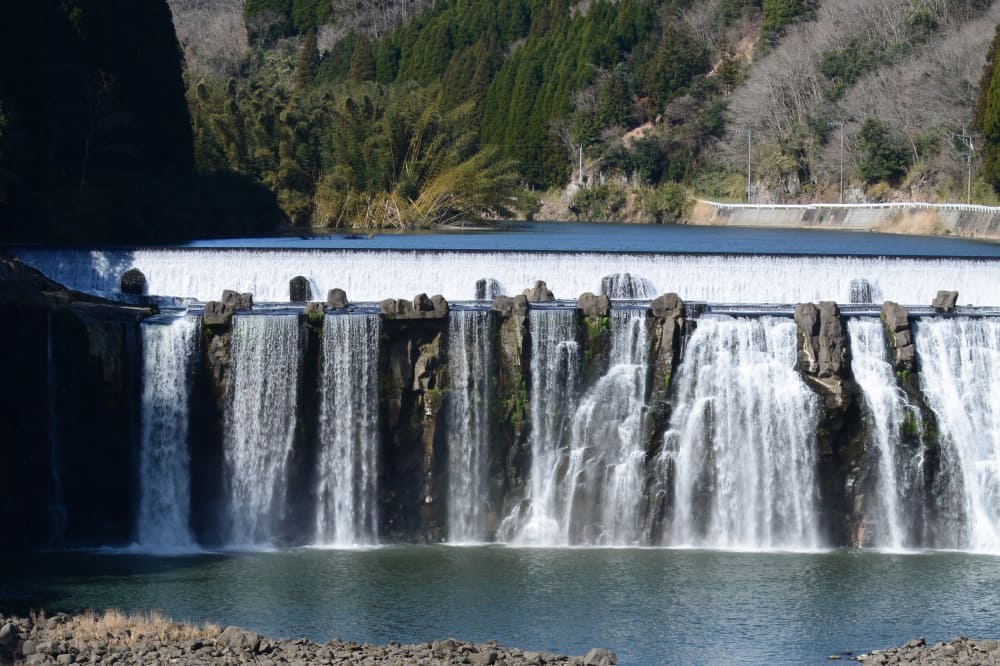 These falls are part of the Ogata River, a tributary of the Ono River, and span 120 meters across and stand 20 meters tall. They formed by the collapse of the ignimbrite resulting from the cooling down of the pyroclasts from the Aso volcano's fourth eruption around 90,000 years ago. The torii gate located upstream of the falls is that of the second shrine of the Three Shrines of Ogata. In the annual Kawagoshi Festival, locals carry a mikoshi portable shrine through the gate.