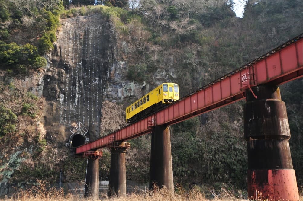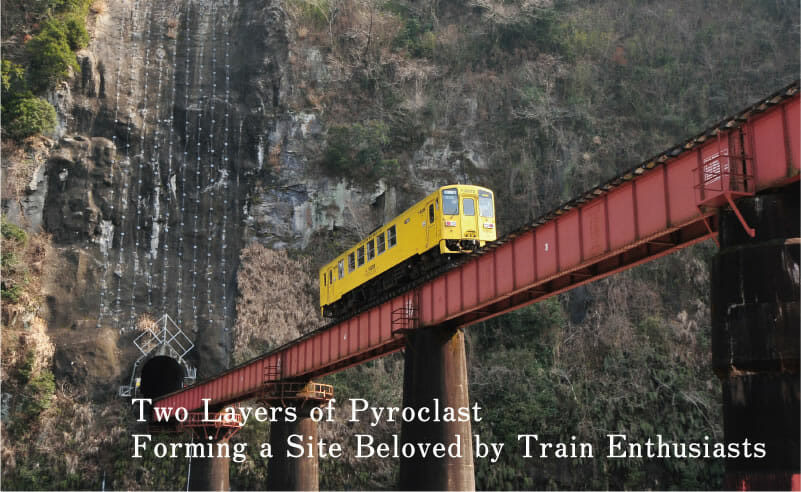 A massive rock wall that stands at the joint between the Ono and Okudake rivers is called the Scenery of Iwado. The lower half of the cliff was formed by the pyroclastic flows from the Aso volcano's third huge eruption, while the upper half was formed by the flows from its fourth eruption. A tunnel for the JR Hohi Line runs right into the cliff face, making the location a famous photo spot for train enthusiasts.