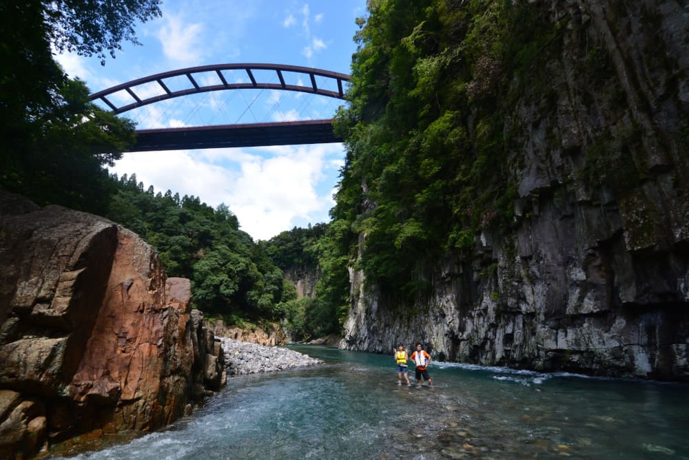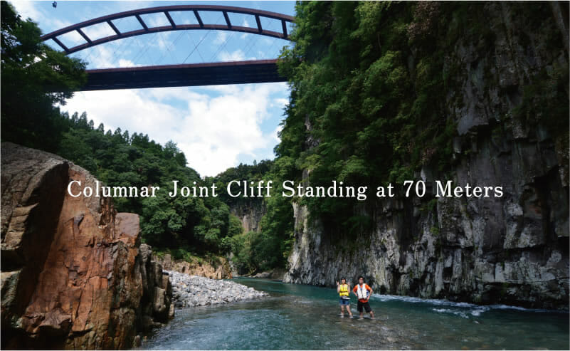 Taizako Canyon is a ravine along the Okudake River flanked on both sides by columnar joint cliffs of ignimbrite. The cliffs stand as tall as 70 meters. The valley floor is home to exposed rocks that came from volcanic activity around 15,000,000 years ago. Further upstream there is even a cave where trees burned by pyroclastic flow are buried.