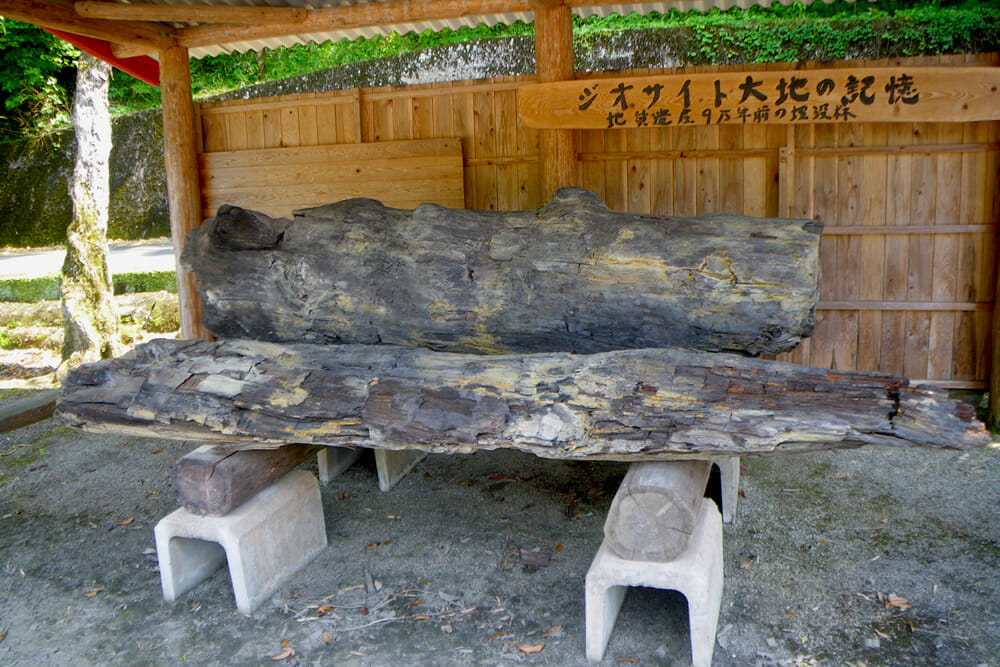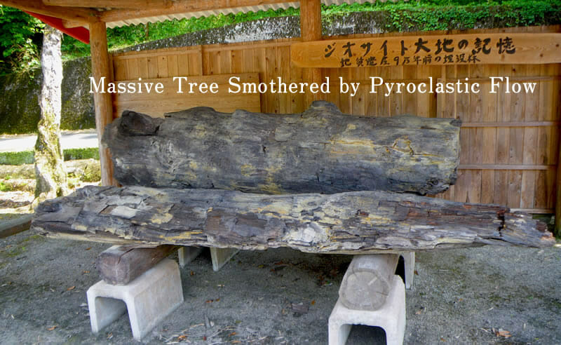 These tree trunks, kept on the grounds of the former Mie-minami Elementary School (now Akai Yane no Sato), were once buried at the bottom of a nearby stream. Pyroclasts from the Aso volcano flowed over the mountains, sweeping down on the trees as they went. These trees were buried under the pyroclasts, and smothered by their heat. You can see evidence of this in the black charred surface of the tree trunks.