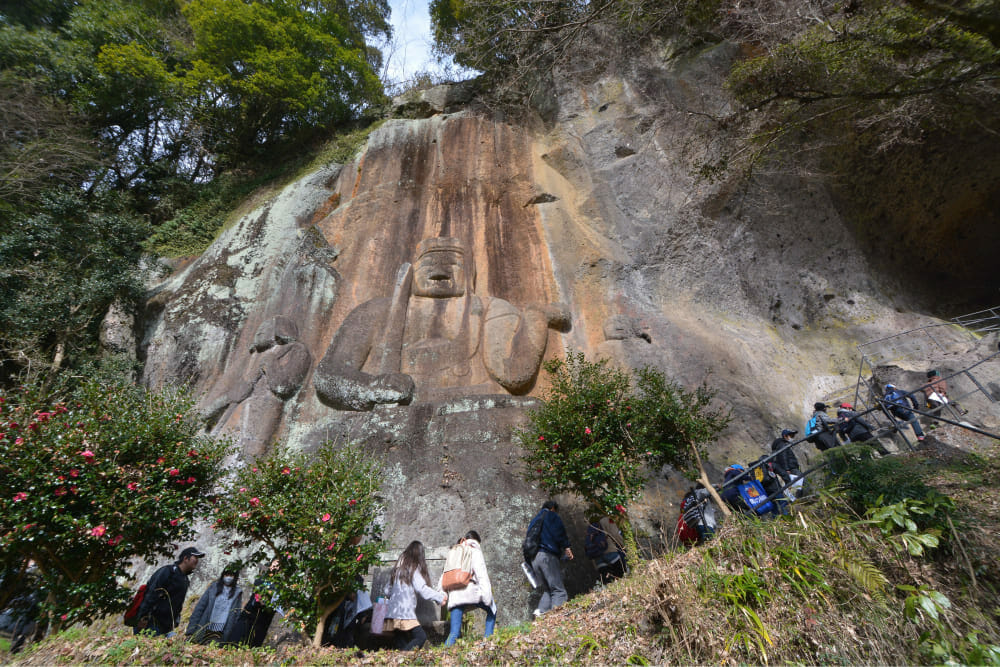 This cliff-carved Buddha, with its odd, seemingly masked face, was made of clay mixed with hemp and other fibers. This stone was formed by pyroclastic flows around 600,000 years ago from a volcano located where Mt. Yufudake stands today. How the statue has worn the current appearance is believed to be by faster erosion of the very fragile stone.