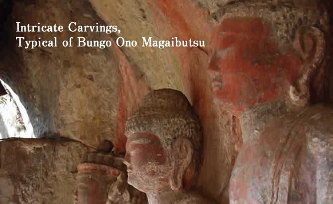 The Sugao Magaibutsu are five stone Buddhas carved in the late Heian period out of ignimbrite formed nearly 90,000 years ago from pyroclasts from the Aso volcano. Crafted just as intricately as the wooden Buddhas of Kyoto and Nara, these carvings have been designated as Nationally Important Cultural Property. Among the many cliff-carved Buddhas of Bungo Ono, these are the most symbolic of all.