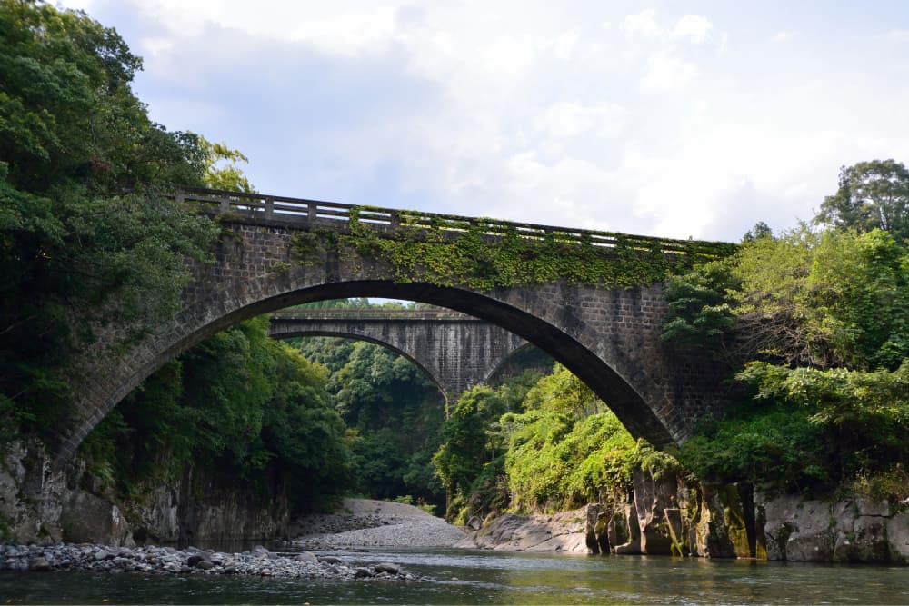 Todoro Bridge is a double arch stone bridge built in 1934 as part of a forest railway. The larger of its arches spans 32.1 meters, the largest in all of Japan. Deai Bridge was built a decade earlier in 1924, and its 29.3 meters arch is the second largest in the country. Along the both shores of the Okudake River, which runs below the bridges, stand majestic columnar joints of ignimbrite formed nearly 90 thousand years ago by pyroclastic flows from the Aso volcano.