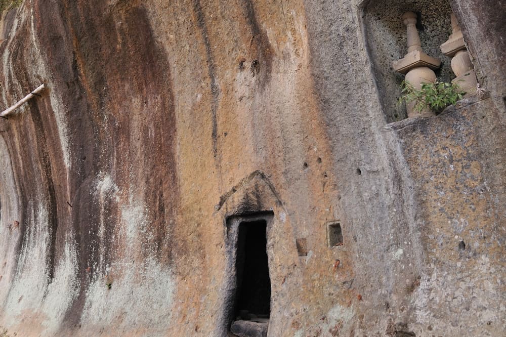 This stone bath is a kind of sauna filling a stone cave with steam. It makes excellent use of the shape of the rock walls of ignimbrite created around 120,000 years ago by pyroclastic flows from the Aso volcano's third eruption. Sanskrit characters for Buddha Amida are carved into the rock wall, offering proof that the location was once used in Buddhist practices.
