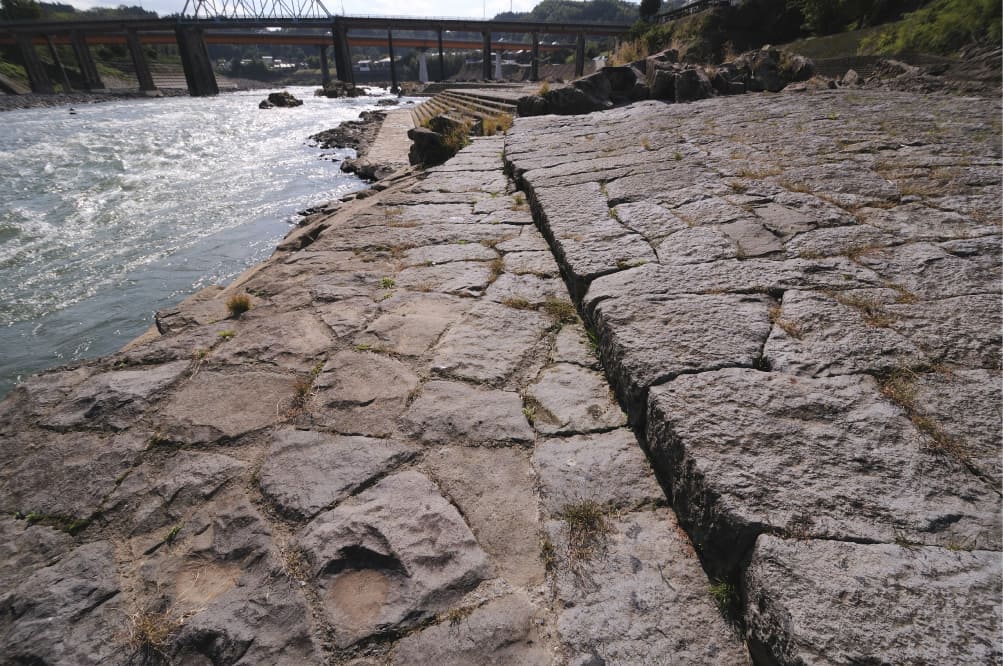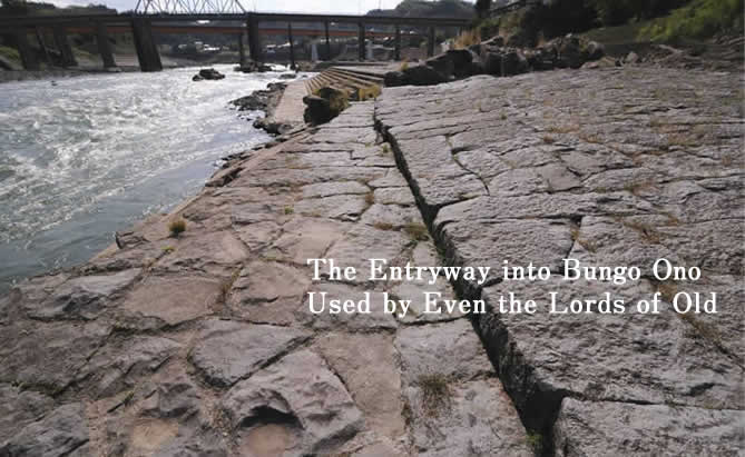 Inukai Port was a riverside port built in the early Edo period. At the time, the Oka Domain held the territory upstream on the Ono River, while the Usuki Domain controlled the area around Miemachi downstream, so travel was carried out on land until here at Inukai, where travelers then went aboard to head for Oita. The riverbed was made up of rugged rocks from a hard stratum, so cut ignimbrite stone was laid to make it into a flat surface.
