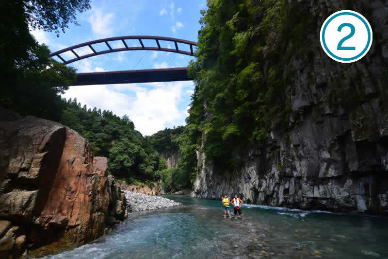 両側を柱状節理の発達した溶結凝灰岩の絶壁で囲まれた、奥岳川沿いの峡谷です。崖の高さは70mにおよびます。