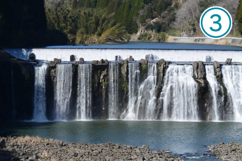 大野川の本流にかかる雄滝は幅約100m、高さは約20mあります。室町時代に雪舟がここを訪れ、「鎮田瀑図」を描いたことでも有名です。