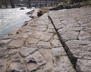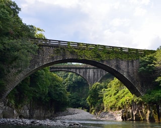 径間日本一と二位の石橋の競演。両岸には見事な「柱状節理」がみられる。